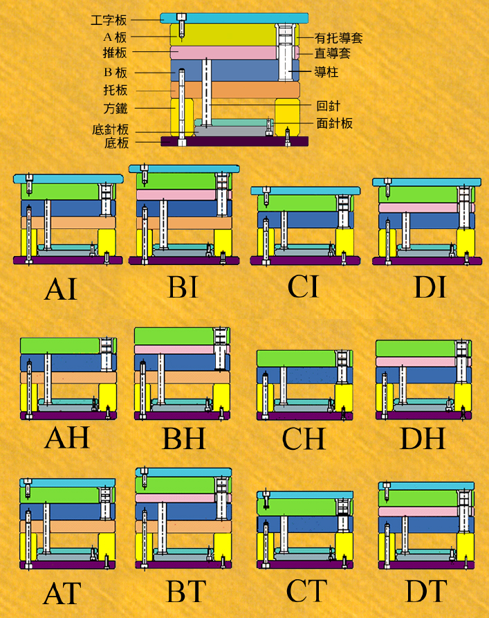 大水口模架 (又稱單分型面模架), 標(biāo)準(zhǔn)長闊尺寸由 150mm x 150mm (簡稱1515系列) 至 600mm x 800mm (簡稱6080系列); 因不同之A板, B 板, 推板及托板組合, 共分 A, B, C, D 四個(gè)型號。 而模架因碼模結(jié)構(gòu)不同, 而有工字模 (I型), 直身模 (H型)及直身模加面板 (T型) 三類, 結(jié)合 A,B,C,D 四個(gè)型號, 標(biāo)準(zhǔn)大水口模架共有 12 種不同型號規(guī)格, 模具制作者可因應(yīng)產(chǎn)品要求而配置不同之板厚組合。